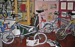 Although we had hoped for rather larger numbers at this event, this was a fair turn out given the location. Quite a lot of people opted to travel by car instead, and a bonus of the different location was that we met some people who do not normally attend our Meriden meetings - Mark and Celeste were particularly welcome after making the long journey from Devon, and it was good to see Jenny and her Bike Friday Gnu - she seems very pleased with it, and after a short trial run on it Celeste seemed to smitten as well! Dick Hanson had travelled from Cheltenham by motor cycle with a number of (motor) biking friends, and they seemed to find the collection just as interesting as the rest of us, and were particularly interested in the small motor cycle section.