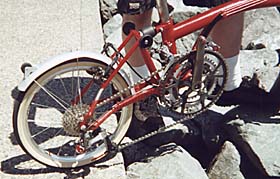 Riding with Chris Dent one each of the three days, he on the SP12 and I on the SP7, we encountered a number of quite steep descents, and we were both very impressed by the handling, stability and very powerful V brakes of the SPs. I would rate their performance in these conditions as at least on a par with the best high specification, high performance small wheelers. Although Chris's 12-speed model has more gears (nominally) and a rather wider gear range, I must say that I much prefer a simple single chainwheel arrangement as on my 7-speed SP. I believe in the KISS principle - keep it simple stupid - and multiple chainwheels add complexity, weight and cost for relatively little benefit. They may have been useful in the days of 5-speed derailleurs, but with 7 to 10 speed blocks now the norm, I'm happy to do without one. I'm in good company too, as Alex Moulton does not seem keen on them either - a reason, perhaps, why factory built NS Moultons are only available in 9-speed form, and those wanting a double chainwheel need to buy one assembled from a frame kit by a dealer.