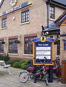 Despite the recent rain, the surface of the towpath was not too bad, though some brick surfaced ascents and sections under bridges were a bit slippery. All went well until we had just passed Sandwell & Dudley station, when Chris Eley's SP suffered a rear puncture. We decided that the main group should go on, in view of the time constraints imposed by the short hours of daylight at this time of year, while I stayed with Chris to guide him the rest of the way: as his bike is equipped with GPS, this was probably unnecessary, but it gave me a chance to see how easy or otherwise it would be to fix a rear puncture on an SP with disc brakes and a Rohloff!. Actually repairs seemed no more of a problem with this rather exotic example than with the rear tyre on a standard Brompton. From here we joined the older high-level canal towpath for the final stretch into Tipton, and then joined the roads briefly to pass the Black Country Living Museum (BCLM) on our way to the Bostin Fittle for lunch. Just beyond the BCLM Chris had a second puncture – this time in the front tyre! We were close enough to the lunch stop to walk the final distance, and the puncture was repaired during the lunch stop.