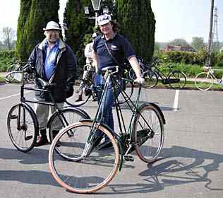 Below: Left - Phil Wray on a 1903 Wulfruna, dressed for the part. Right: Another pair of folder regulars are Dick (where did you get that hat?) Hanson on a 1950's Rudge and wife Hazel on a 1936 BSA Ladies Sport.